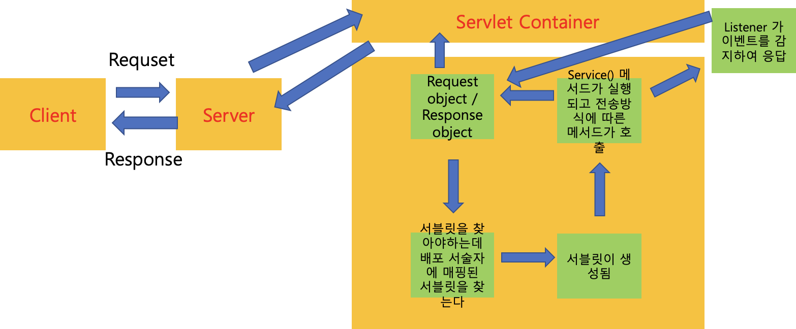 λμ μ리λ servlet μ΄ μμ±ν service() κΈ°λ₯μ΄ μ€νλμμ λ μ΄λ²€νΈλ₯Ό κ°μ§νμ¬ μ²λ¦¬νκ³ Response object λ‘ μλ΅μ λ΄λ¦½λλ€.