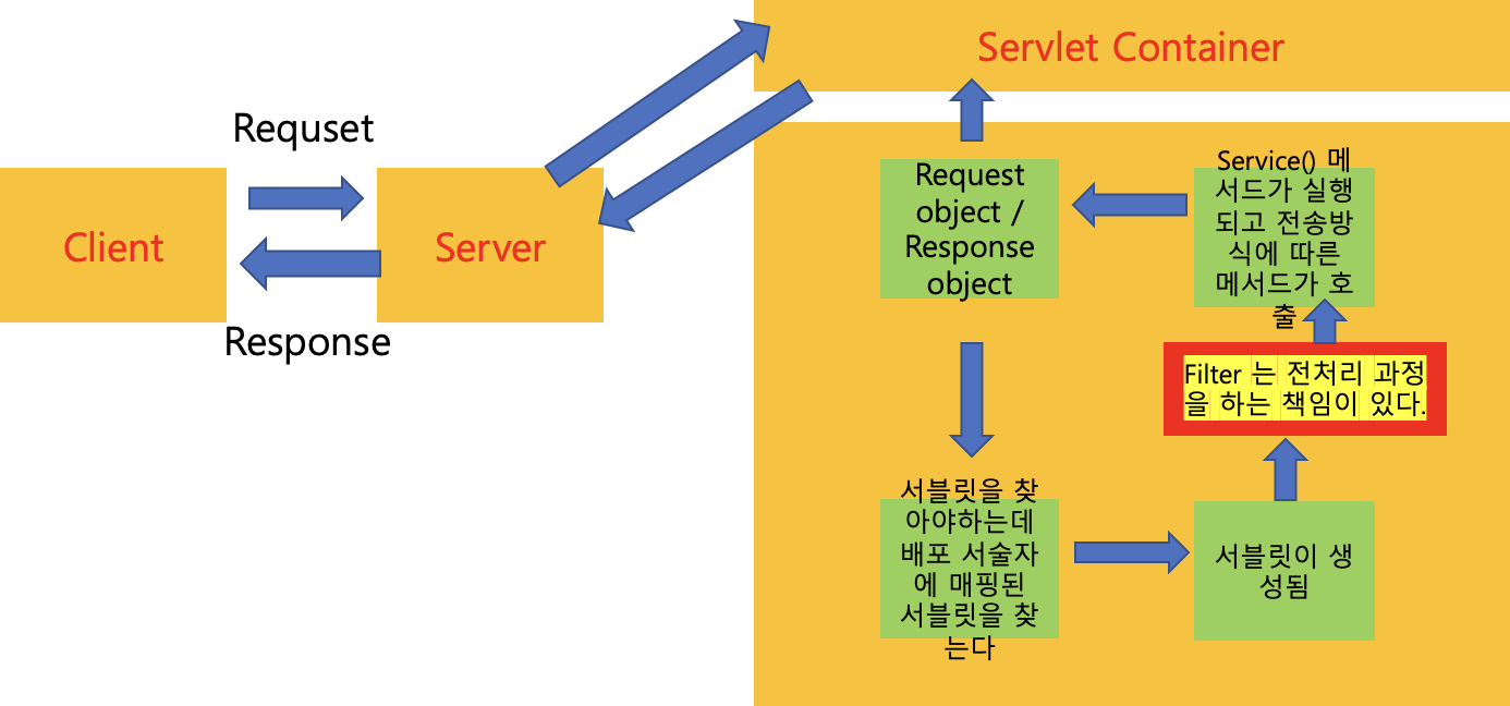 ServletFilter 의 λ™μž‘μ›λ¦¬λŠ” Servlet μ—κ²Œ μš”μ²­μ΄ 보내지기 전에 μ•ž λ‹¨μ—μ„œ μ „μ²˜λ¦¬ 과정을 κ±°μΉ˜λŠ” 과정을 κ±°μΉ©λ‹ˆλ‹€.