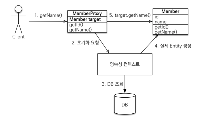 이 객체를 사용시에 영속성 컨텍스트에 초기화를 요청하고 영속성 컨텍스트는 DB에 원본 엔티티를 조회하고 생성 한다.