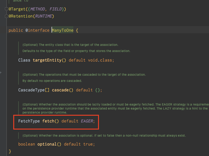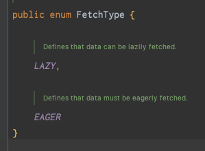 fetch() 속성을 잘보면 기본값이 EAGER 로 설정되어 있다. EAGER 는 즉시 로딩을 뜻하며 연관관계가 맺어진 엔티티의 정보들을 전부 로딩 시켜준다.