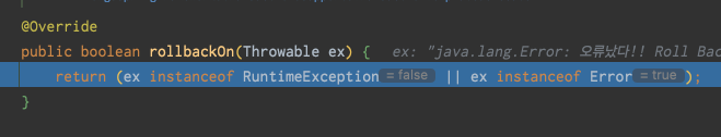 조건문을 타고 rollbackOn() 메서드에 의해 예외 타입을 체크하고 타입에 맞게 RollBack 이 진행되게 된다.