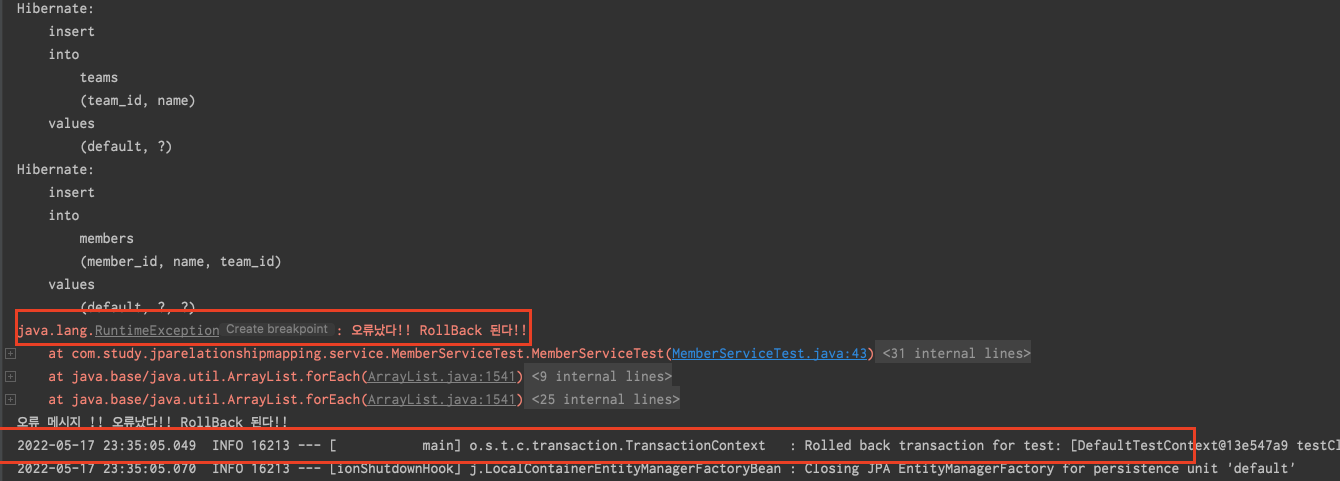 위 코드는 Team 엔티티와 Member 엔티티의 데이터 값을 저장하고 RuntimeException 을 던지며 RuntimeException 의 예외 처리를 하는 코드이다.