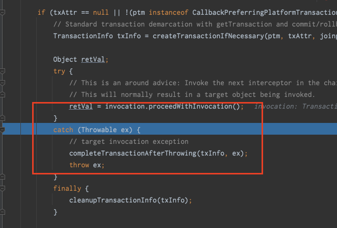 TransactionAspectSupport 의 클래스의 invokeWithinTransaction() 메서드에서 예외를 잡는다.
