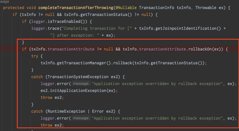 completeTransactionAfterThrowing() 메서드에서 예외를 파라미터값으로 넘겨 조건문을 진행한다.
