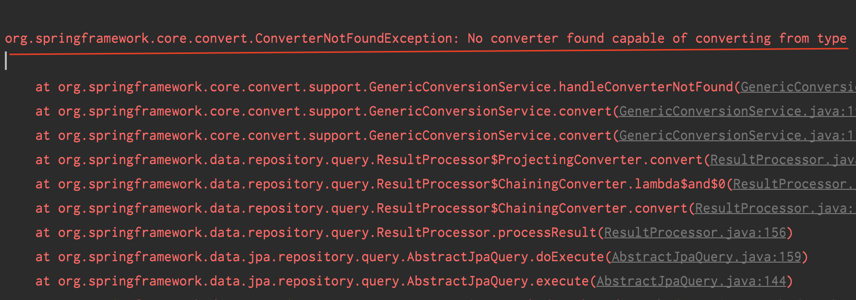 에러를 찾아 본 결과 jpa projections 으로 해결을 해야했다.