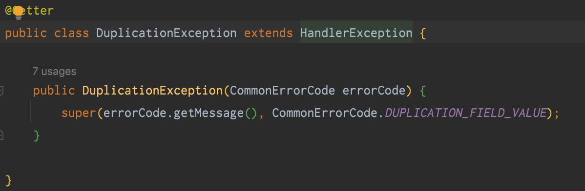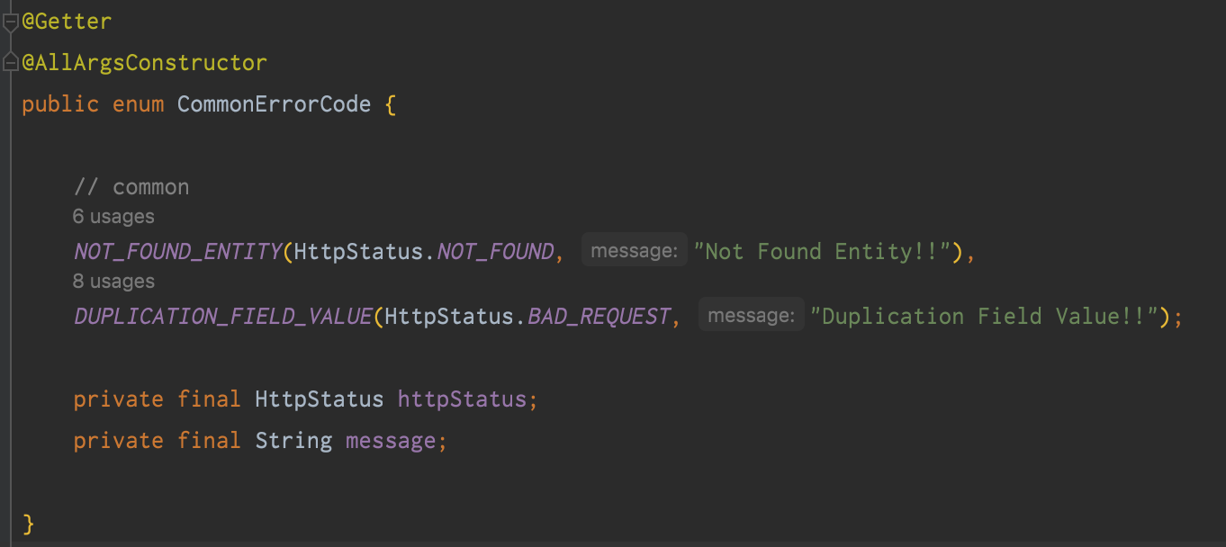 예외를 던진 때의 메시지와 에러 타입들이 다를 것이고 동일 한 부분도 있을 것이다. 하지만 흩어져 있는 코드 하나의 열거타입에 관리하여 이를 통해 사용하면 통일성 있고 명확하게 처리할 수 있을 것이다.