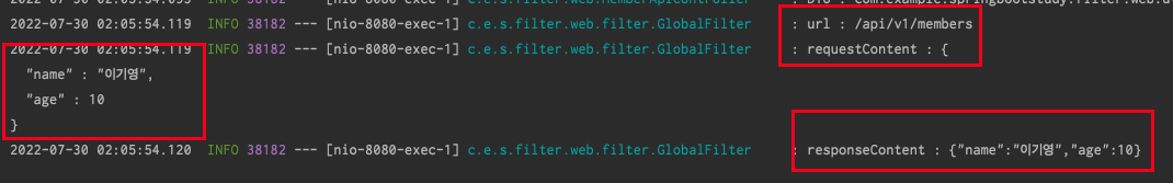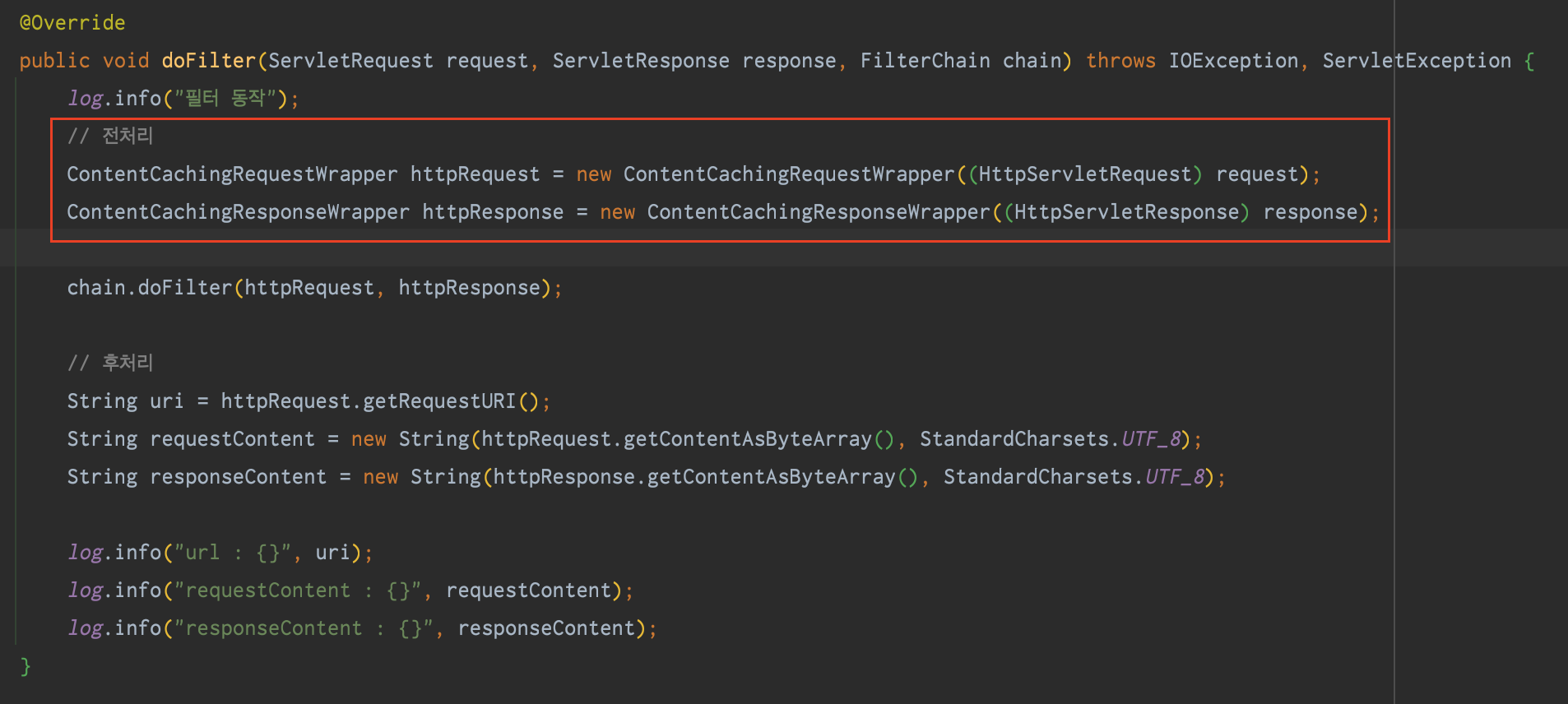 다음으로 chain.doFilter(httpRequest, httpResponse) 을 호출 하고 후 처리 과정에서 요청 응답 정보를 담아 logging 작업을 한다.
