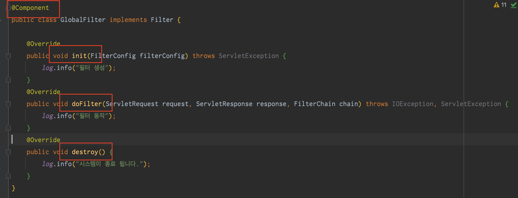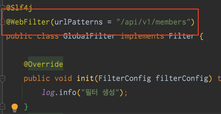 하지만 @WebFilter 라는 에노테이션을 선언 해줘야 한다.