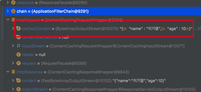 실제로 디버깅을 해보면 chain.doFilter() 가 호출이 된 후에 요청 응답 정보를 읽어온다.