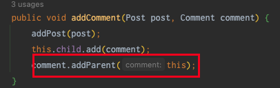 이러한 메서드를 보면 제일 마지막에 들어오는 comment가 parent가 되어 계층구조가 역순으로 되는 현상이 발생한다.