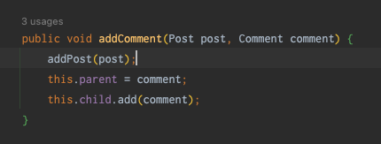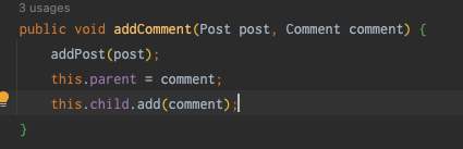 Comment 객체를 매개변수로 받아 parent에 넣어주고 child에 add()를 하는 메서드인데…
