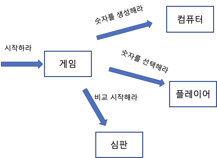 이러한 구성도는 심판 플레이어 컴퓨터 중 하나만 코드를 변경해버리면 게임을 빈번히 수정해야하는 문제점이 있고 객체 지향 스럽지가 않다.