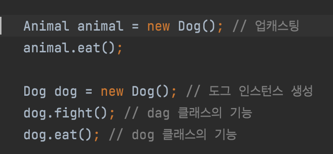 위의 코드를 보시면 부모 클래스의 Animal에 있는 eat() 메서드들을 오버라이딩해 사용하고 있는 것을 볼 수 있습니다.