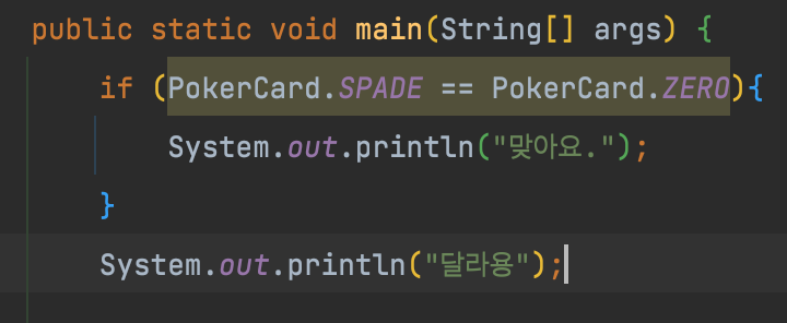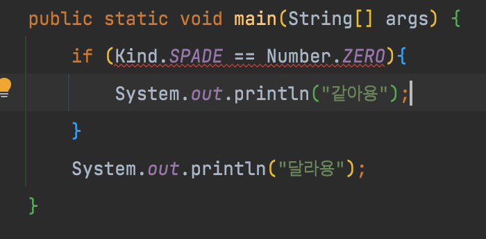 카드의 무늬와 숫자 2가지 타입의 상수들을 정의 해놓고 같은 값들을 비교해보면 같다고 나온다.